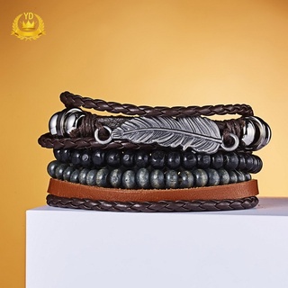Bộ 4 Vòng Tay Da Bện Đính Hạt Gỗ Có Thể Điều Chỉnh Cho Nam