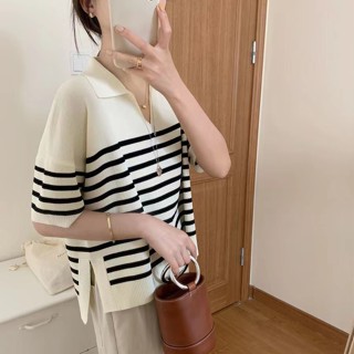 Áo polo ngắn tay dáng rộng họa tiết kẻ sọc trẻ trung cho nữ
