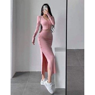 SET ĐẦM TAY DÀI GÀI NÚT CHÂN VÁY XẺ NÚT