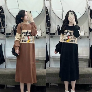 Váy bầu – Đầm bầu dáng suông thu đông dài tay chất nỉ da cá in họa tiết hoạt hình mickey cực cute VD356