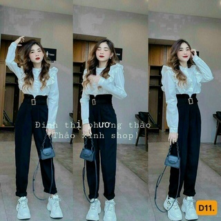 Sét bộ nữ áo kiểu sơ mi phối bèo tay dài kèm quần dài ống thụng trẻ trung, xinh xắn thời trang nữ cho nàng công sở