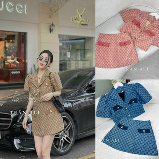 Set váy nữ cổ vest croptop họa tiết chữ đính nút thích hợp cho các nàng đi dự tiệc hoặc đi làm sang chảnh, xinh xắn