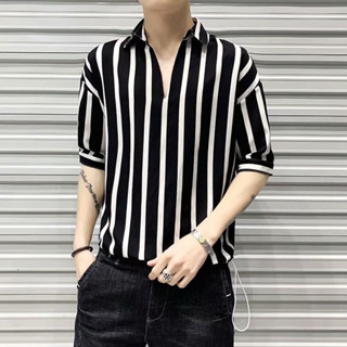 Áo Sơ Mi Ngắn Tay Cổ Chữ V Họa Tiết Kẻ Sọc Phối Màu Trắng Đen Đơn Giản Thời Trang Mùa Hè Cho Nam