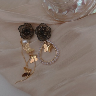 Bông Tai Thời Trang Kiểu Bất Đối Xứng Hình Hoa Hồng & Bướm Đính Ngọc Trai Cổ