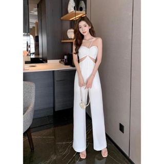Jumpsuit trắng, quần dáng xuông có mút ngực