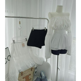 SET ÁO VOAN TRẮNG TRỄ VAI BO EO BẢN + SHORT ĐEN
