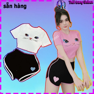 Đồ bộ nữ Tiểu Thư CÓ SẴN Sét áo croptop in hình mặt mèo phối quần đùi viền trái tim cực xinh , chất thun bozip đẹp