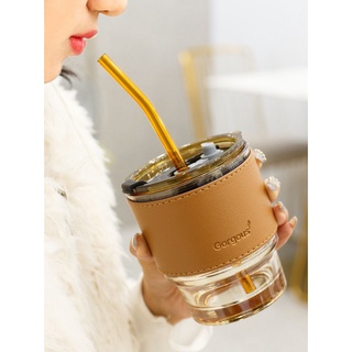 Ly thủy tinh uống nước (kèm Vỏ da + Nắp + Ống hút) màu hổ phách chịu nhiệt nóng lạnh cỡ 400ml C3