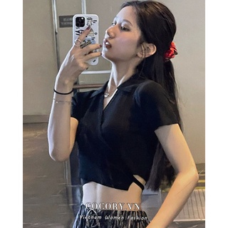 Cocory vn Áo Croptop Dệt Kim Tay Ngắn Cổ Chữ V Thiết Kế Độc Đáo Thời Trang Mùa Hè Quyến Rũ Cho Nữ