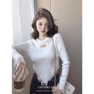 Cocory vn Áo Dệt Kim Nữ Tay Dài Dáng Ôm Phối Tua Rua Thời Trang
