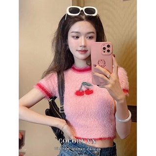 Cocory vn Áo croptop dệt kim tay ngắn màu hồng gợi cảm dành cho nữ