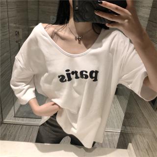 Áo Thun Trễ Vai Tay Ngắn Hoạ Tiết Chữ Thiết Kế Thanh Lịch