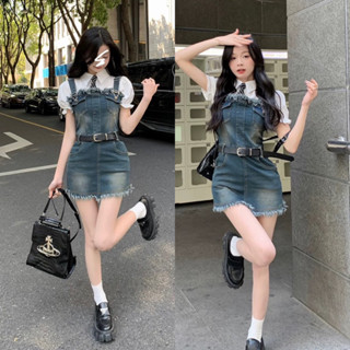 Yếm Jean Viền Tua Rua Dáng Ngắn Kèm Đai Belt (hàng Quảng Châu) Váy Denim 2 Dây Bản To Ulzzang Style