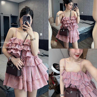 Set Áo 2 Dây Tầng Kèm Short Kẻ Hồng Mùa Hè (hình thật) Set Hồng Kẻ Chất Mát Xinh Xắn