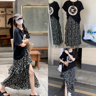 Set Áo Thun Kèm Chân Váy Hoa Nhí Xẻ Tà (hàng Quảng Châu loại 1) Áo Thun Đen Kèm Chân Váy Hoa Nhí Dài Mùa Hè 2023