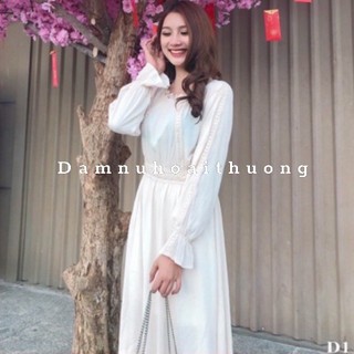 Váy nữ trắng dáng dài /Đầm thiết kế phối ren tay bồng che khuyết điểm