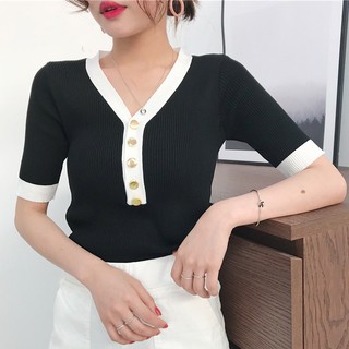Áo thun dệt kim tay ngắn phối nút thiết kế cổ chữ V thanh lịch