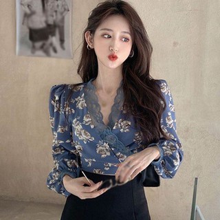 Áo kiểu tay phồng phối ren hoa thiết kế cổ chữ V nữ tính