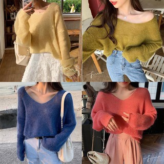 Áo sweater nữ tay dài cổ chữ V màu trơn