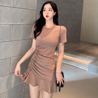 Váy Nữ Đầm Ngắn Tay Cổ Tròn Thiết Kế Rút Dây Thanh Lịch Cho Nữ