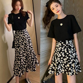 Set áo thun + chân váy hoạ tiết hoa cúc phong cách Hàn Quốc cho nữ