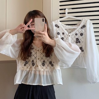 Áo Croptop Áo Kiểu Tay Dài Phồng Cổ Vuông Dáng Ôm Chất Liệu Chiffon Thời Trang Hàn Quốc Cổ Điển Cho Nữ