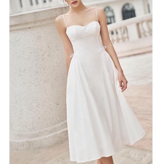 Đầm trắng đi dự tiệc cưới thiết kế dáng xòe, cổ V, đính nơ sang trọng