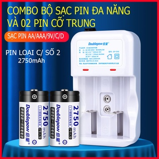 Combo bộ sạc DP-D02 và 2 viên pin cỡ trung 2750mAh (size C) chính hãng Doublepow