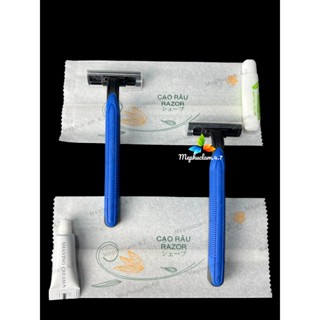 100 dao cạo râu cán cao su xanh dương kèm kem cạo đút túi giấy hoa in chữ tự hủy cho khách sạn, nhà nghỉ,...