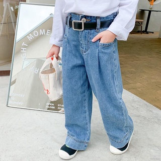Quần Jean Dài Dáng Rộng Ống Suông Phối Thắt Lưng Kiểu Hàn Quốc Dễ Phối Đồ Cho Bé Gái