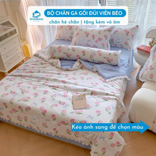 Bộ chăn ga gối đũi viền bèo 5 món, chăn hè chần bông tặng kèm vỏ gối ôm Dreamhomebeding