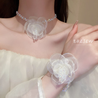 DREJEW Khuyên tai dáng dài hình hoa chất liệu organza pha lê màu bạc chất lượng cao