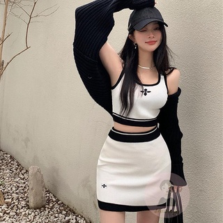 Bộ Áo Dệt Kim Không Tay Cổ Chữ U Màu Sắc Tương Phản Phối Chân Váy Ngắn Lưng Cao Thời Trang Mùa Hè Cho Nữ
