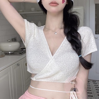 Áo Dệt Kim Ngắn Tay Cổ Chữ V Màu Trơn Thời Trang Cho Nữ