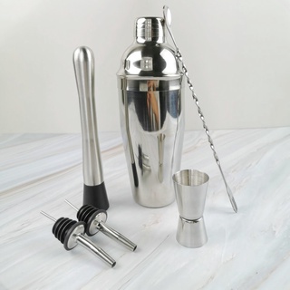 Combo dụng cụ pha chế Inox 6 món: Bình shaker 750ml + Chày bar + Thìa bar 26cm + Jigger 2 đầu 15/30ml + 2 cái vòi rót