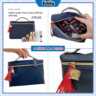 [Có Video] Túi đeo và Ví hộp trụ tròn Estee.Lauder auth tách gift set da Navy Blue Red Set đựng mỹ phẩm