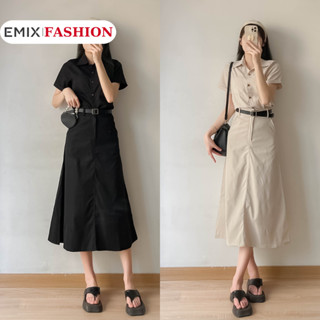 Set váy retro EMIX, áo sơ mi và chân váy dài chất kaki thô mềm (tặng kèm đai), size dưới 54kg, dáng dài, cộc tay 036
