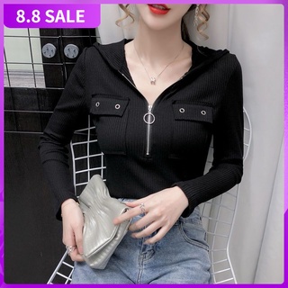 Áo thun có nón tay dài cổ chữ V có khóa kéo 95% cotton thời trang mùa xuân quyến rũ cho nữ 2021