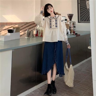 Set Áo Sơ Mi Tay Dài Phối Chân váy jean Lưng Cao Thời Trang retro Cho Nữ