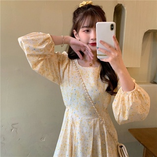Đầm tay dài in hoa màu vàng nhạt thời trang mùa thu mới cho nữ