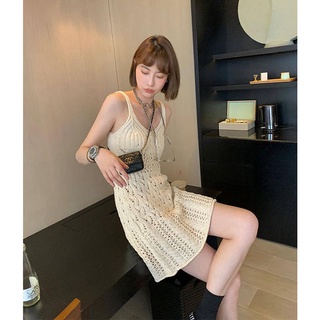 [13C] Đầm Dệt Kim Hai Dây Dáng Ngắn Xếp Chồng Lỗ Mẫu Mới Thời Trang Mùa Xuân