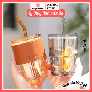 Ly thủy tinh mix da , cốc thủy tinh bọc da 450ml kèm ống hút sang trọng