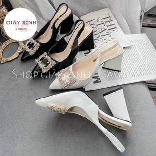 Giày cao gót 6 phân da nhăn cao cấp quai hậu cài, Sục nữ đính hoa đá sang trọng Mã G75