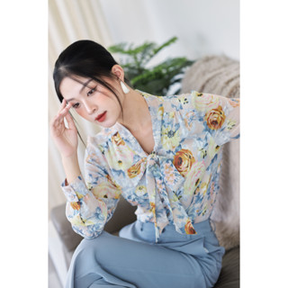 Áo Sơ Mi Nữ Thắt Nơ GILLEE Tay Phồng Voan Hoa Có Lót FAK059