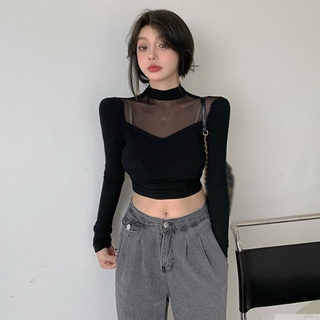 Áo Thun Tay Dài Phối Lưới Xuyên Thấu Phong Cách Hàn Quốc