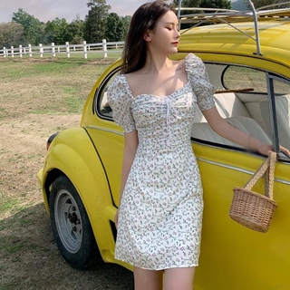 Đầm Tay Ngắn Phồng Cổ Vuông Màu Sắc Ngọt Ngào Phong Cách Hàn Quốc