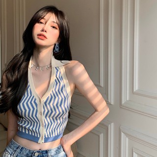 Áo croptop không tay cổ yếm màu sắc tương phản thời trang Hàn Quốc mùa hè cho nữ