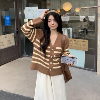 Áo khoác cardigan dệt kim tay dài dáng rộng cổ chữ v phối nút cài họa tiết sọc thời trang Hàn Quốc cho nữ