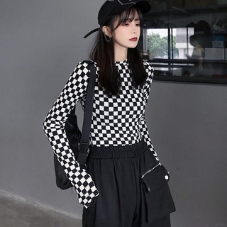 Áo thun tay dài dáng ôm họa tiết sọc caro phong cách Hàn Quốc dành cho nữ