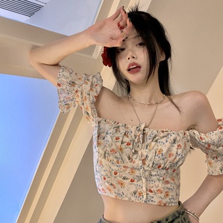 Áo Croptop Cổ Vuông Tay Ngắn In Họa Tiết Hoa Thời Trang Mùa Hè Hàn Quốc Cho Nữ